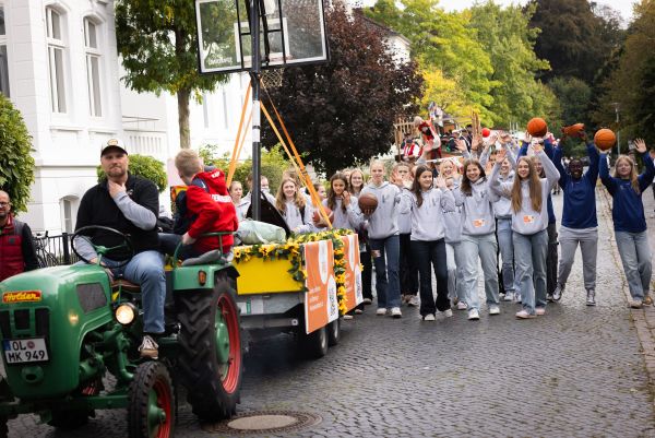 Die Voraussetzungen konnten fast nicht besser sein - nicht zu warm, nicht zu kalt und ab und zu schaute auch mal die Sonne raus. Und so versammelten sich rund 30 Basketballspielerinnen hinter dem festlich geschmückten Anhänger samt Korbanlage. Dieser wurde gezogen von einem historischen Traktor der Marke Holder B12 Baujahr 1961, mit dem sich Jan-Bernd Heitmann bereits am frühen Nachmittag auf den Weg zu seiner Startposition in der Bismarckstraße gemacht hatte. Später reihte man sich dann von dort aus in den laufenden Festumzug ein. Thematisch durchaus passend hinter der großen Gruppe des OTB, den EWE Baskets und dem Schulbus des Fördervereins der Cäcilienschule, ging es vorbei am Staatstheater und dem Lappan, über den Pferdemarkt Richtung Donnerschwee, um schließlich an der Ehrentribüne einen letzten kräftigen Applaus zu genießen. Unterwegs gab es nur strahlende Gesichter und natürlich auch den ein oder anderen erfolgreichen Korbleger. Die Menge der vorab besorgten Kamellen passte perfekt - doch der eigentliche Renner waren die Lippenpflegestifte im MBO-Design, die von den Zuschauerinnen