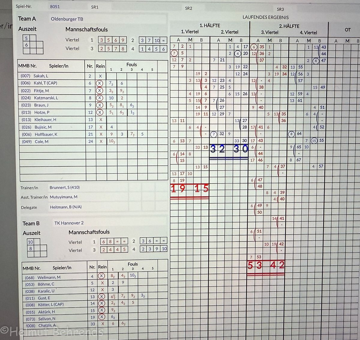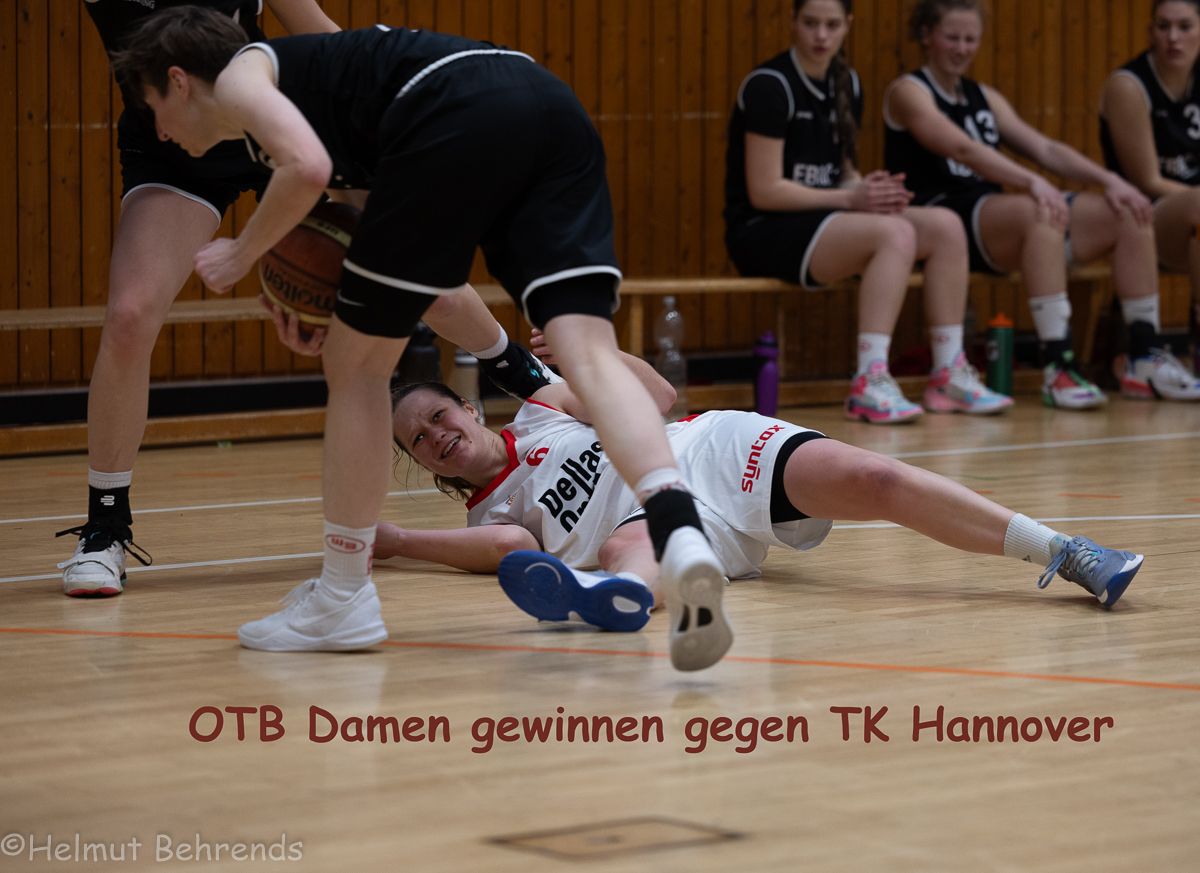 Beim Rückspiel in der 2. Regionalliga zwischen dem OTB und TK Hannover II traten zwei stark veränderte Teams im Vergleich zum Hinspiel an. Bei Hannover liefen lediglich fünf Spielerinnen aus dem Hinspiel auf. Durch die erste Grippewelle des Jahres geschwächt fielen beim OTB gleich sechs Spielerinnen aus, darunter fast der komplette Spielaufbau mit Anna Kaune, Liska Renke und Johanna Göpfert. So sah man sich gezwungen, diese spieltragenden Rollen auf andere Spielerinnen zu verteilen und dabei auch nicht so erfahrene Nachwuchsspielerinnen wie Mascha Bujisic und Mia Fittje in die Verantwortung zu bringen. Von Spielbeginn an durfte erstmalig beim OTB die 16jährige Mia Fittje auflaufen und zeigte sich ihrer neuen Rolle mehr als gewachsen. Sie allein scorte in der 1. Halbzeit 16 der insgesamt erzielten 32 Punkte und sorgte so wesentlich dafür, dass die Partie mit einem leichten Vorteil für den OTB zur Halbzeitpause endete (32:30). Und dieses Spiel verlief äußerst spannend. Nach einem 9:0 Start für den OTB gelang Hannover ein 11:0 Lauf und danach wechselte die Führung immer hin und her. Der OTB war dabei vom Tempo her überlegen, Hannover hatte Vorteile unter dem Korb.