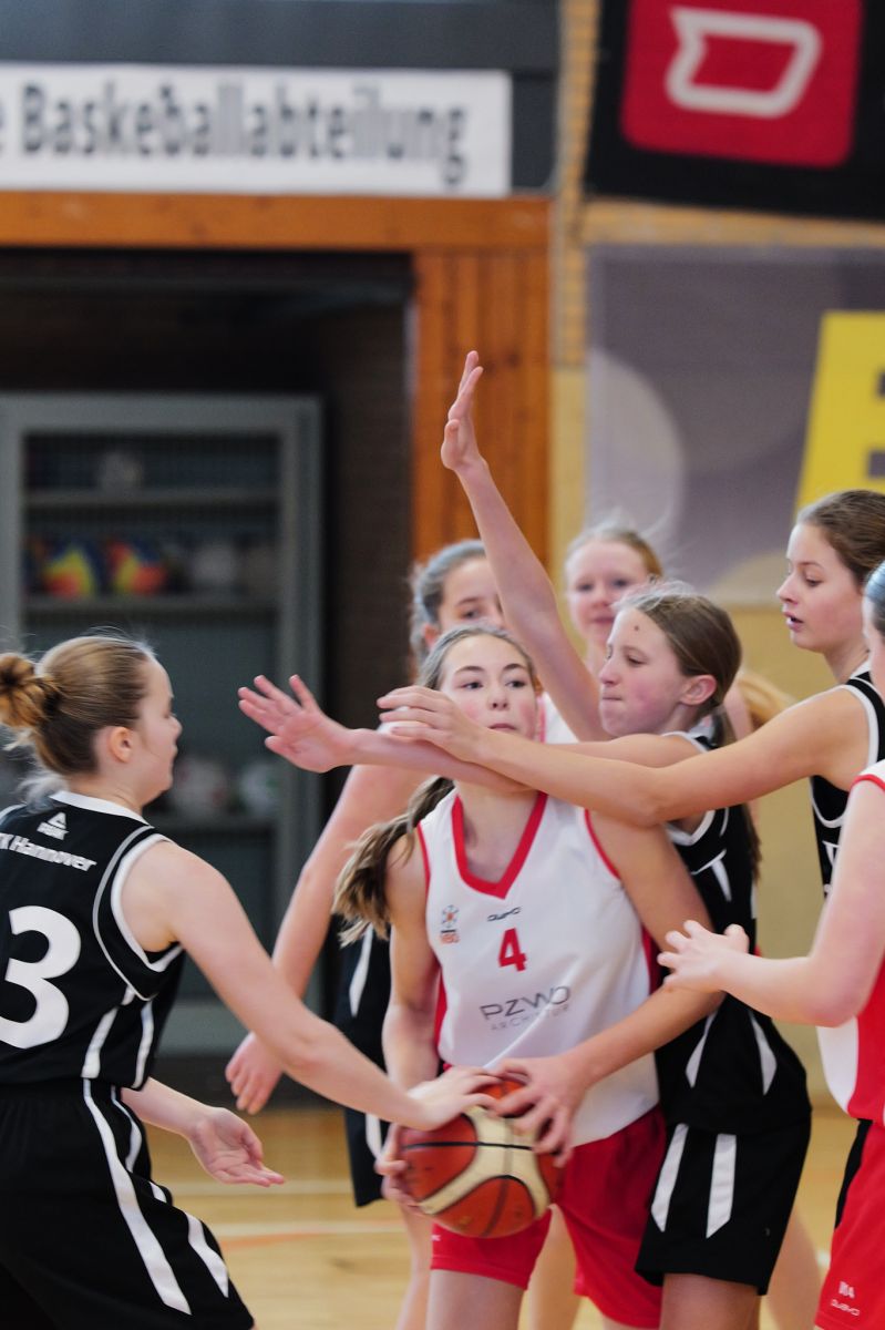 Was war das denn für ein Spiel? Eine Halbzeit zum Haareraufen und eine Halbzeit eine schöne Demo guten Teambasketballs. Aber erst einmal vorweg: die U14 Mädchen des OTB haben hochverdient mit 69:54 (14:15, 27:32, 53:40) gegen den TK Hannover gewonnen. Nur eine Person stand nach dem Spiel auf der Tribüne mit einem breiten Lächeln im Gesicht: Matildas Vater. Er konnte erst zur zweiten Halbzeit kommen und attestierte der Mannschaft eine tolle Entwicklung und war sehr angetan vom richtig guten Teambasketball, den er von den OTB Mädchen gesehen hatte. Die erste, die Horrorhalbzeit hatte er nicht mitgekriegt. Und da ging wirklich gar nichts. Die OTB Mädchen agierten saft- und kraftlos, legten die leichtesten Bälle daneben, dribbelten unmotiviert immer wieder in die Gegenspielerin hinein und ließen sich die Bälle aus der Hand nehmen. Was war denn da los? Dabei wirkte Hannover doch gar nicht unüberwindbar stark. Lediglich die starke Nr. 13, Tietze, stellte die OTB - Verteidigung immer wieder vor Rätsel. Das sollte dennoch machbar sein. Bis zur Halbzeit fand man aber kein Mittel, um aus dieser Schockstarre herauszukommen. Ece war es mit ihren guten Offensivaktionen zu verdanken, dass der Vorsprung der Hannoveranerinnen sich in Grenzen hielt.
