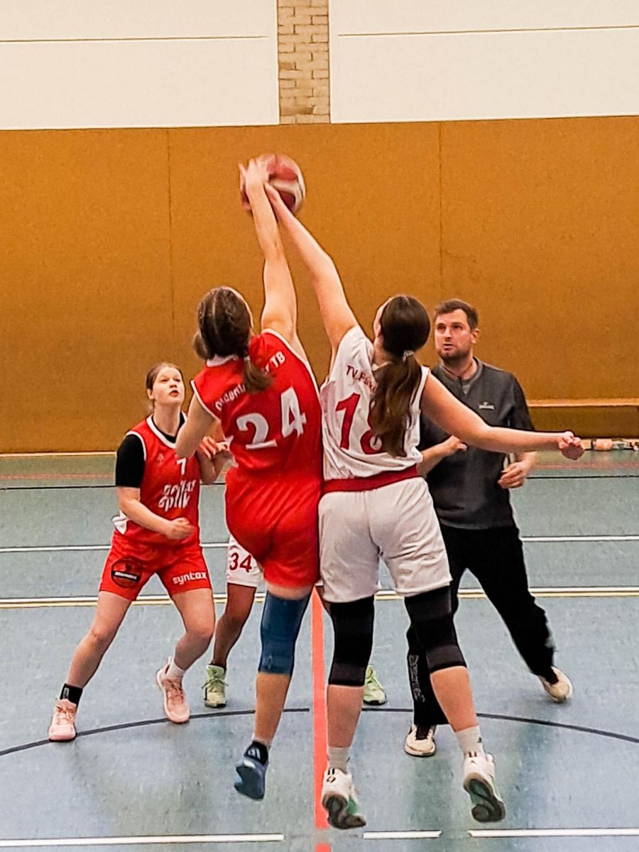 Mit Glitzerkonfetti im Haar der Mädchen und ihres Trainers gingen die U16 Spielerinnen des OTB in ihre erste Saisonpartie in der Landesliga beim TV Falkenberg. Von Oldenburger Seite wurde mit Spannung erwartet, wie die Mannschaft mit ihren vielen neuen Spielerinnen zusammenfinden würde. Eine große Menge Spielerinnen, Familienmitglieder, Freunde und Bekannte waren zum Support auf beiden Seiten erschienen, was dem Spiel einen tollen Rahmen gab. Die mit vielen großen Spielerinnen versehene Falkenberger Mannschaft präsentierte sich zum Spielstart bärenstark, war wesentlich besser eingespielt und ging über ihre großen Spielerinnen unter dem Korb schnell in Führung (12:6, 5.). Danach verlief die Partie ausgeglichener und zur Viertelpause hieß es 18:14. Da man gegen die großen Spielerinnen unter dem Korb wenig ausrichten konnte, versuchte der OTB nun die bis dahin spielbestimmende Falkenberger Anspielerin Alicia Vrsek im Aktionsradius einzuschränken. Das gelang im zweiten Viertel zunehmend besser. Malina Kulcke, Matilda Steinhoff und Morlin Bock leisteten hierbei hervorragende Arbeit. Gleichzeitig gab Marla Hombert im Angriff mehrere Kostproben ihre großen Wurfbegabung. Sie versenkte den Ball aus allen Lagen. Am Ende des Spiels sollten allein 4 (!) erfolgreiche Dreier von ihr auf dem Scoutingbogen stehen. Aber zurück zum Spielverlauf: beim 26:26 (14.) hatte man das erste Mal den Ausgleich erzielen können. Auch wenn Falkenberg gleich wieder auf 34:26