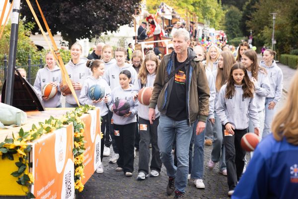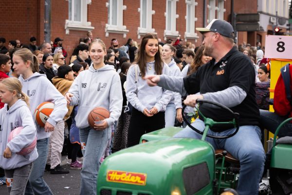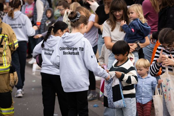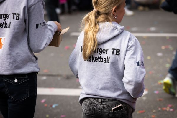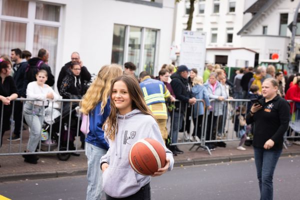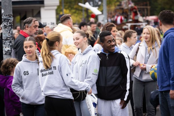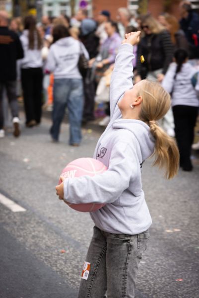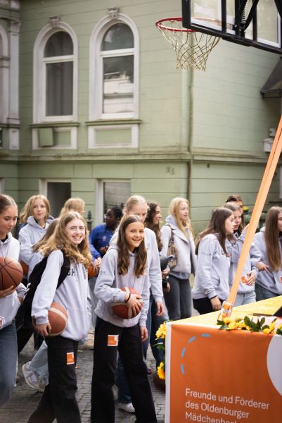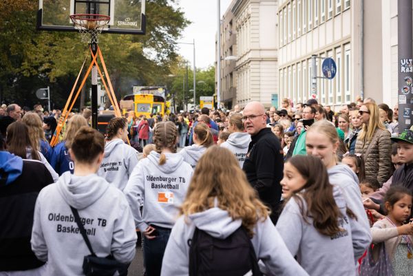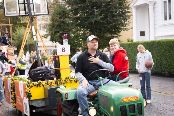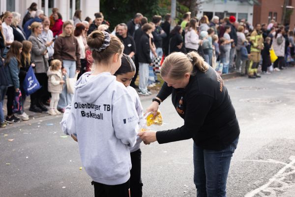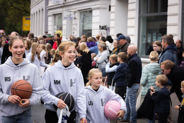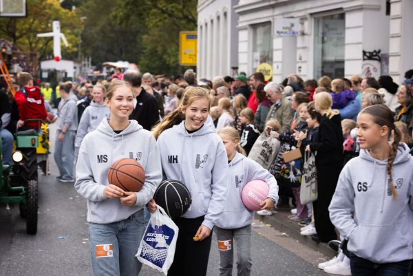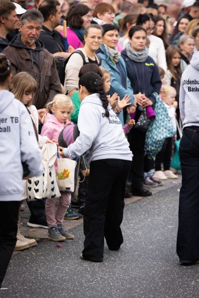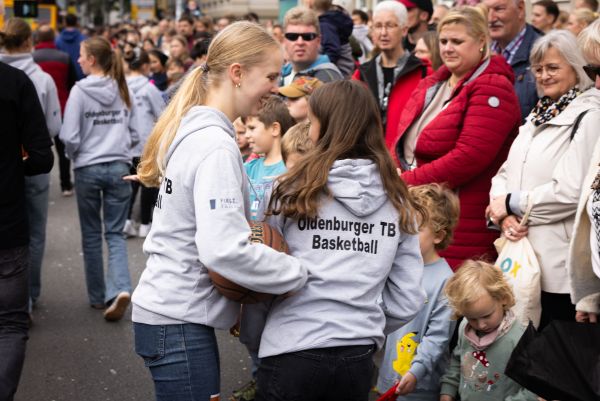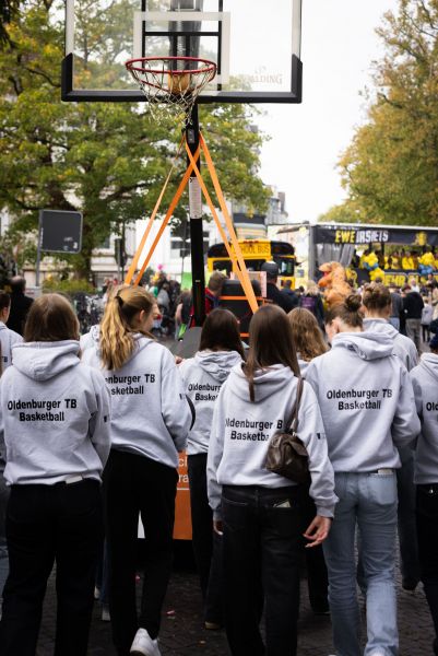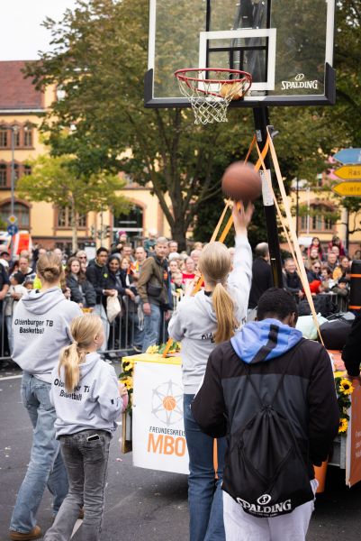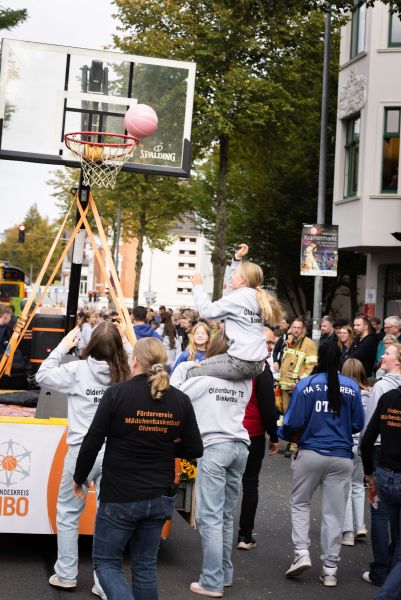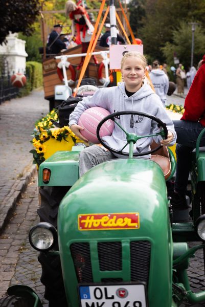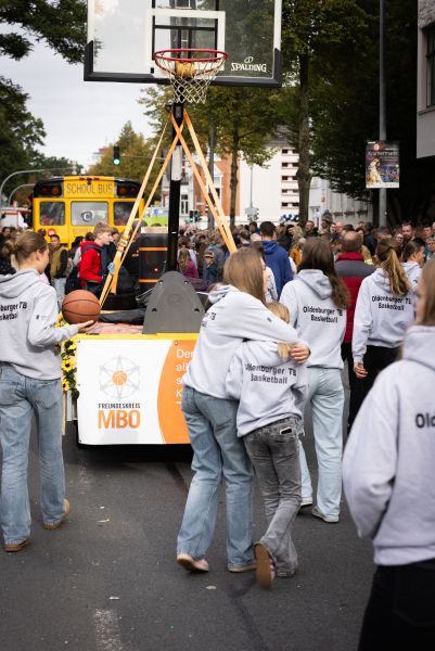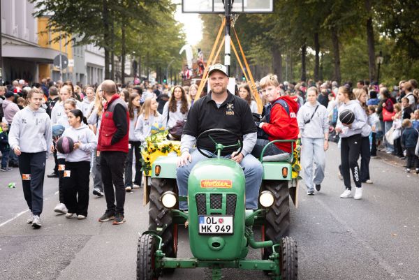 Die Voraussetzungen konnten fast nicht besser sein - nicht zu warm, nicht zu kalt und ab und zu schaute auch mal die Sonne raus. Und so versammelten sich rund 30 Basketballspielerinnen hinter dem festlich geschmückten Anhänger samt Korbanlage. Dieser wurde gezogen von einem historischen Traktor der Marke Holder B12 Baujahr 1961, mit dem sich Jan-Bernd Heitmann bereits am frühen Nachmittag auf den Weg zu seiner Startposition in der Bismarckstraße gemacht hatte. Später reihte man sich dann von dort aus in den laufenden Festumzug ein. Thematisch durchaus passend hinter der großen Gruppe des OTB, den EWE Baskets und dem Schulbus des Fördervereins der Cäcilienschule, ging es vorbei am Staatstheater und dem Lappan, über den Pferdemarkt Richtung Donnerschwee, um schließlich an der Ehrentribüne einen letzten kräftigen Applaus zu genießen. Unterwegs gab es nur strahlende Gesichter und natürlich auch den ein oder anderen erfolgreichen Korbleger. Die Menge der vorab besorgten Kamellen passte perfekt - doch der eigentliche Renner waren die Lippenpflegestifte im MBO-Design, die von den Zuschauerinnen