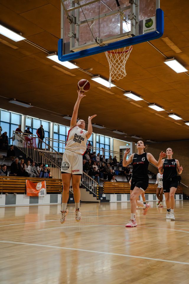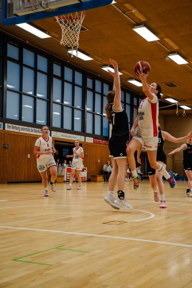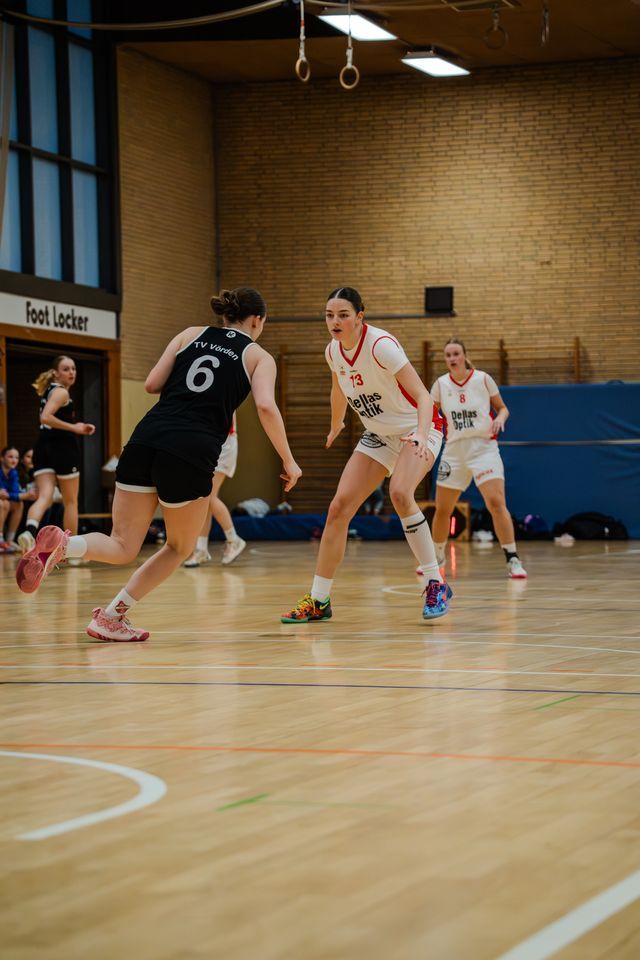 Nichts für schwache Nerven war das Spiel des OTB gegen TV Vörden. Wie zu erwarten erwies sich der TV Vörden als echt "dicker Brocken". Von Anfang an war Vörden das lebendigere Team. Die Aufbauspielerinnen zogen immer wieder leicht in die Oldenburger Zone, legten den Ball für die Werferinnen draußen auf und die trafen. Der OTB spielte vorne unkonzentriert. Teilweise wurde regelrecht rumgewurstelt. So kam es dazu, dass Vörden meist ein wenig in Führung lag, der OTB mit schwierigen Treffern aber den Anschluß hielt. Zwei Körbe von Lilu Doms und Anna Kaune brachten den OTB dennoch mit 16:15 in die Viertelpause. Im zweiten Viertel ging es so weiter und Vörden setzte sich Pünktchen für Pünktchen ab. Durch einen Dreier von Merle Krämer betrug der Vorsprung sogar 6 Punkte (23:29, 18.). Ein schön herausgespielter Korb von Malea Sprehe und ein Dreier von Lilu Doms brachten den OTB wieder etwas heran. Mit 28:31 ging man zur Halbzeit in die Kabine. Mit Beginn der zweiten Halbzeit spielte der OTB plötzlich wie umgewandelt. Vorne wurde der Ball schneller bewegt, der Raum weiter gemacht und schon gab es leichtere Würfe. Mit einem schönen Dreier aus der Ecke von Hanne Kleihauer und einem Korb von Jana Braun lag man schnell 33:31 vorne (2.). Und hinten zeigte man nun, wie man Vördens Dribbeloffensive mit einer verbesserten 1 gegen 1 Verteidigung lahmlegen kann. Nun hatte sich auch Neuzugang Malea Sprehe, die ja bekanntlich aus Vörden kommt, richtig ins Spiel eingefunden. Im Duell mit ihrer durchsetzungsstarken und trickreichen jüngeren Schwester Pia auf Vördener Seite war sie nun die auffälligere Spielerin. Malea ging nun jedem Ball hinterher, setzte sich auch in schwierigen Positionen unter dem Korb gekonnt durch und hatte immer ein Auge für freie Mitspielerinnen. Der OTB Zug nahm nun richtig Fahrt auf. Zwei weitere Dreier (Mia Fittje und Matilda Cole) sowie mehrere schön herausgespielte freie Würfe sorgten für ein 20:7 Viertelergebnis. Der OTB führte 48:38. Damit hatte der OTB sein Pulver allerdings weitestgehend verschossen und das Spiel entwickelte sich zu einer regelrechten Abwehrschlacht. Und Vörden versenkte einige schwierige Würfe und kam noch einmal bedrohlich nahe heran (50:49, 37.). Die Halle war allerdings inzwischen zu einem regelrechten Tollhaus geworden und die gut 100 Zuschauer peitschten den OTB lautstark nach vorne. Das half. Zwei leichte Körbe durch Jana Braun brachten den 54:51 Endstand (39.). Danach wurde der Ball so gut "versteckt", dass Vörden keine Chance mehr bekam, einen leichten Korb zu erzielen. Gewonnen. Mit dem Sieg festigte der OTB nun bei sechs Siegen ohne Niederlage die Tabellenspitze in der Liga.