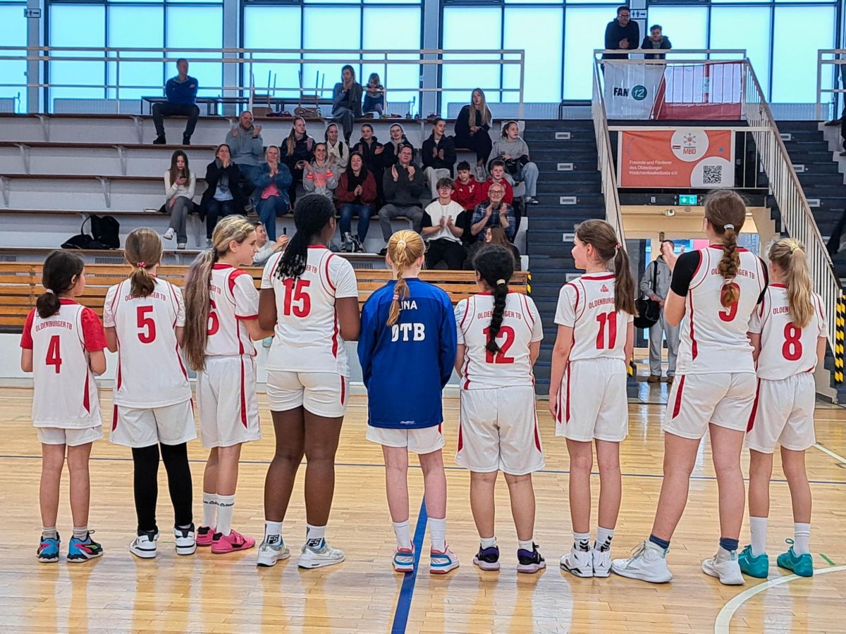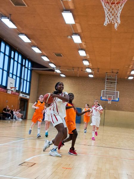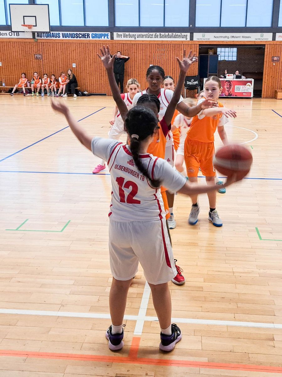 Tabellenführer OTB gegen den vierten. Da ist doch ein klarer Sieg zu erwarten. Oder nicht? Nein, wenn der Gegner das nicht will, ist das ein richtig schwieriges Unterfangen. Im ersten Achtel konnte der OTB eine kleine Führung herausspielen (8:5). Dann übernahmen die einsatzfreudigen und laufstarken Achimerinnen jedoch das Kommando und nutzten jeden kleinen Fehler des OTB in der Deckung aus. Am Viertelende stand es dann auch 10:14 für die Gäste. Dann standen im dritten Achtel jedoch Lina und Nikol gleichzeitg auf dem Feld und neutralisierten die Biba Offensive fast im Alleingang. Auch wenn mal eine Achimerin an allen OTBerinnen vorbei kam, schwupps waren entweder Lina oder Nikol wieder da und bremsten die Dribblerin aus. Dieser Einsatz sollte sich dann auch im Ergebnis zeigen. Auch, weil Lale oft von Arishma geschickt wurde und so schnell einmal 11 Punkte in dem Achtel markieren konnte. Am Ende des Achtels stand es dann 21:17. Der Drive in der Verteidigung hatte sich nun auf alle übertragen. Auch Hanna und Liv legten sich nun richtig ins Zeug und Tea lieferte vorne und hinten wie gewohnt. Zur Halbzeit hieß es dann 29:18. In der zweiten Hälfte legten im Angriff auch Hannah, Mikel und Lina noch einen Zahn drauf. Arishma glänzte weiter als Passgeberin. Hinten war die Verteidigung weiterhin das Kernstück des Spiels. So hieß es am Ende des Spiels verdient 61:36. Die Mannschaft steht weiterhin ungeschlagen an der Tabellenspitze bereitet sich nun auf das letzte spiel gegen Bremerhaven vor.