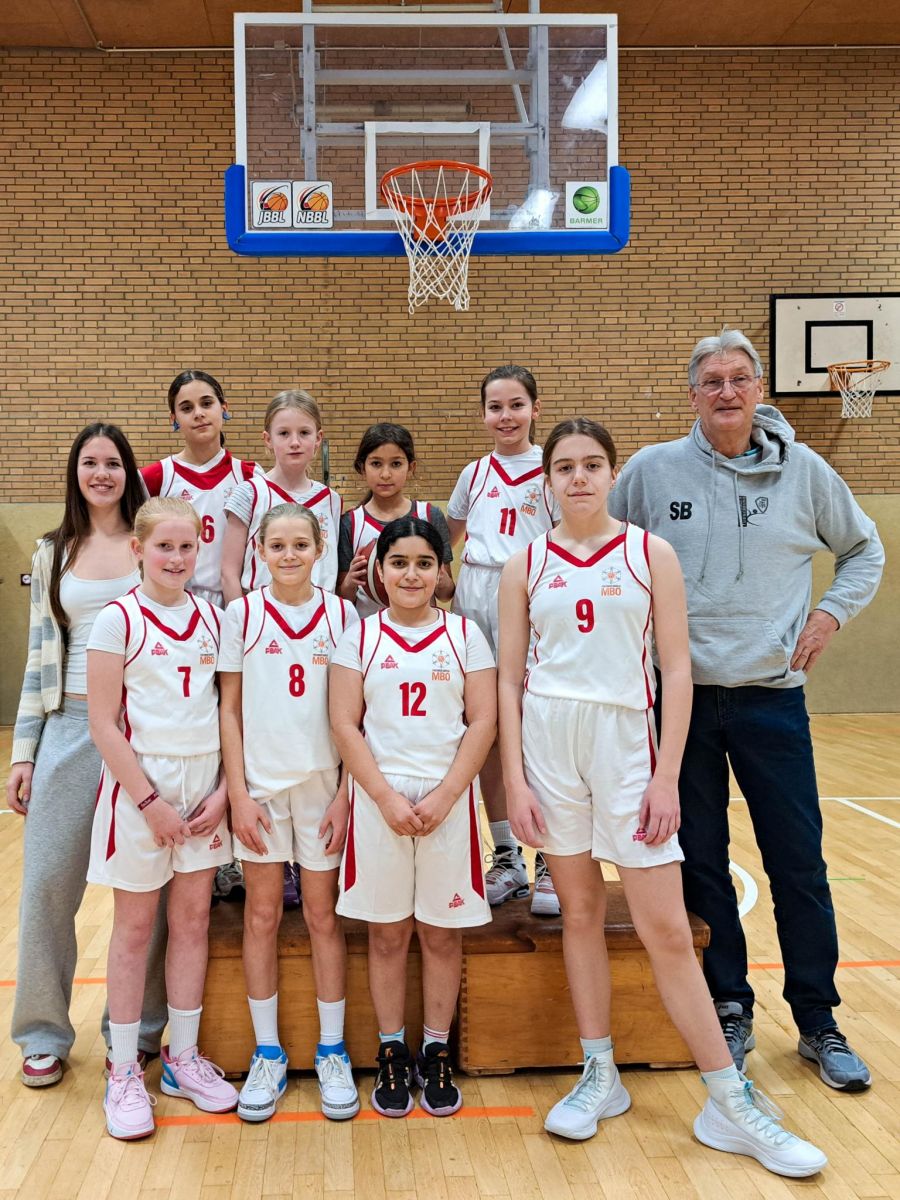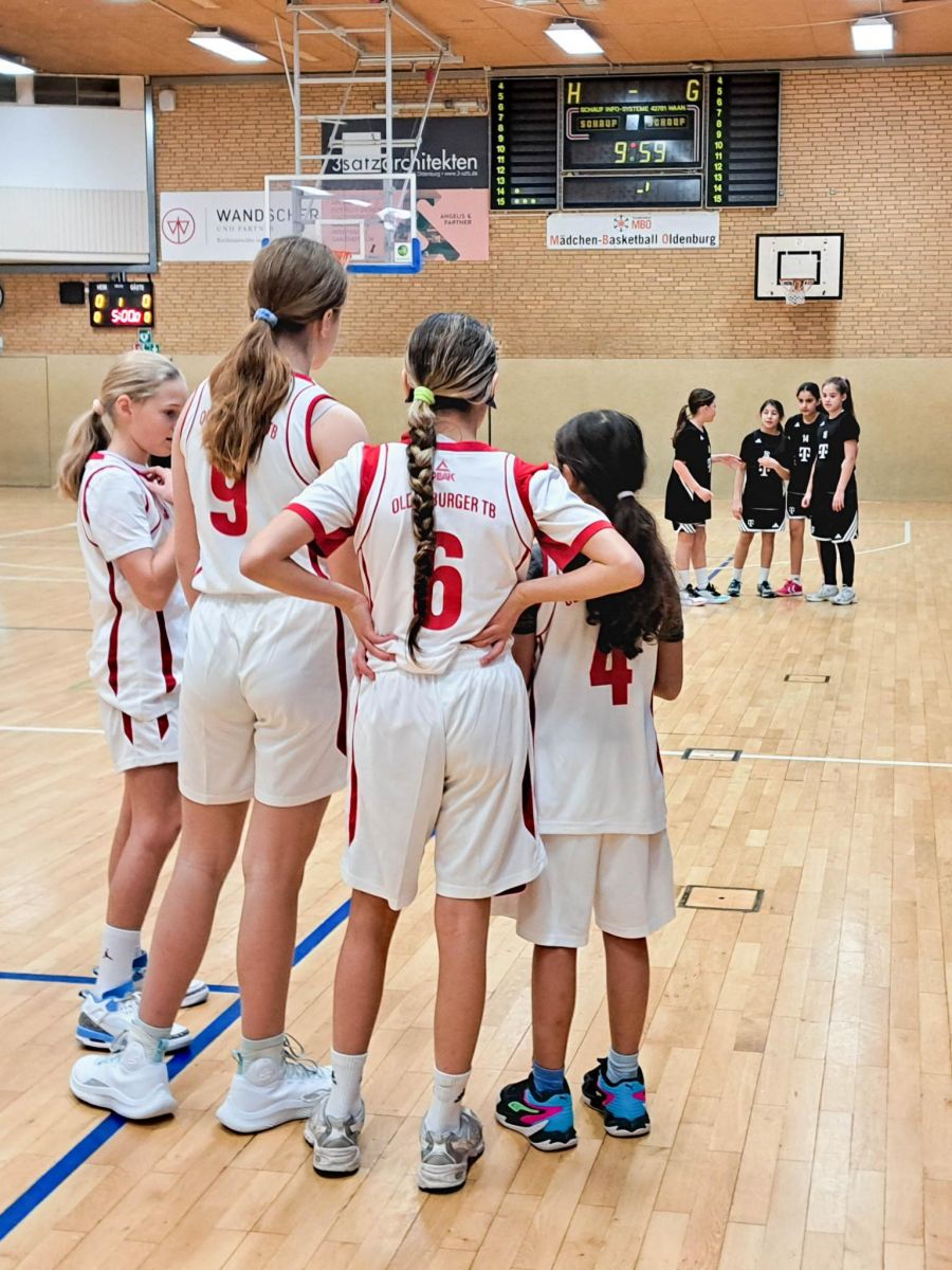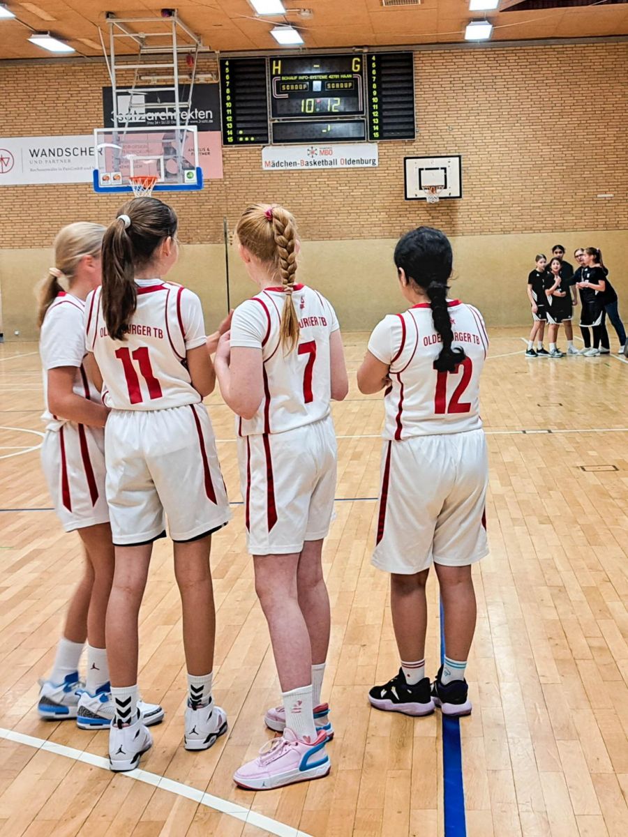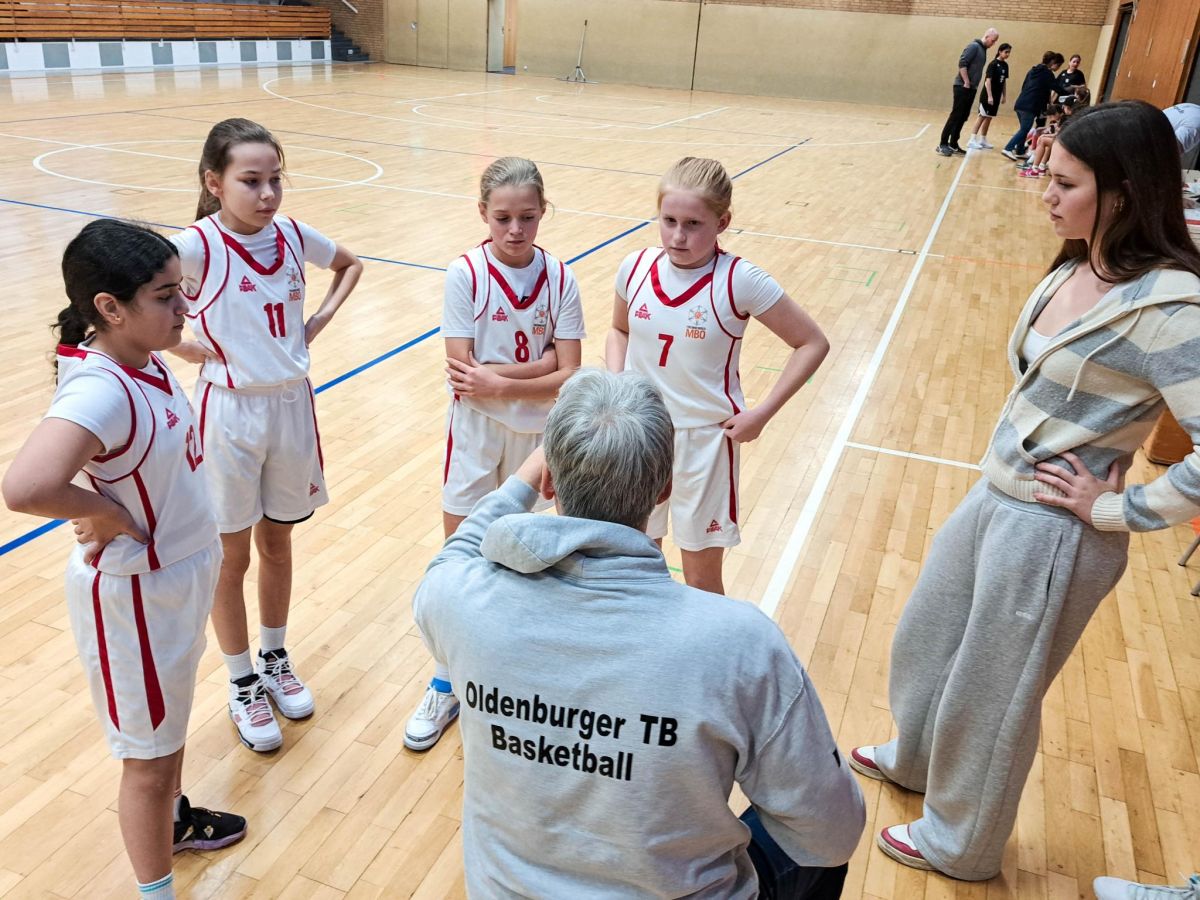 Beeindruckend war die Überlegenheit der OTB U12 Mädchen beim 124:7 (22:2, 44:2, 52:4, 60:4, 77:4, 89:4, 100:4) Erfolg gegen den jüngsten Nachwuchs des BTS Neustadt (Bremen). Es war deutlich sichtbar, welchen Unterschied es ausmacht, ob die Mädchen absolute Anfängerinnen oder doch schon etwas länger dabei sind. Waren es zunächst viele Einzelaktionen (vor allem durch die scheinbar unkaputtbare Lale Lerdon), die den Vorsprung des OTB anwachsen ließen, so entwickelte sich zunehmend ein Mannschaftsspiel, in dem auch die beiden Youngster Hanna Youssri (9 Jahre) und Finja Lettau (8 Jahre) immer munterer mitmischten. Bei Finja sollten am Ende des Spiels sogar 5 Punkte, davon ein verwandelter Dreier, auf dem Spielbogen erscheinen. Und auch Hannah, Arishma (viele tolle Pässe), Nikol, Tea und Lina gaben mächtig Gas und markierten alle Körbe, was für die Ausgeglichenheit des Kaders spricht. Schön anzusehen waren die in der zweiten Hälfte die zunehmenden Passkombinationen, die teilweise auch schon über mehrere Stationen liefen. Die junge Trainerin Sofia Angelis, die in der zweiten Halbzeit das Coaching ganz alleine übernommen hatte, konnte mit ihrem Debut jedenfalls hochzufrieden sein. Die Fans in der Halle waren es allemal.